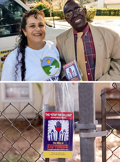 De gick från dörr till dörr och delade ut exemplar av Vägen till lycka med ett specialdesignat omslag där det stod ”Stop the Killing”. De talade till varje person om vad de oroade sig över. Till och med efter att en misstänkt person greps av polisen fortsatte de in på 2018, tills alla hushåll nåddes med de 21 levnadsreglerna.